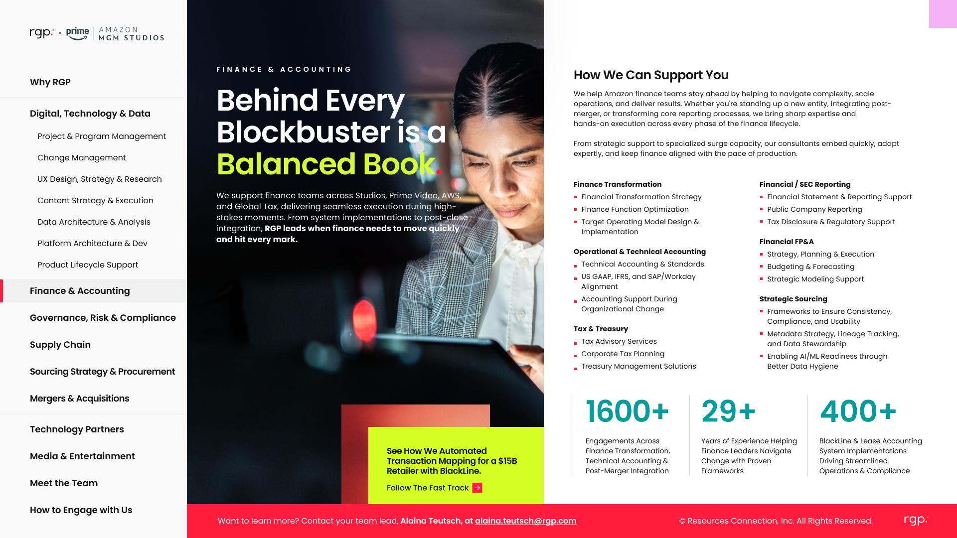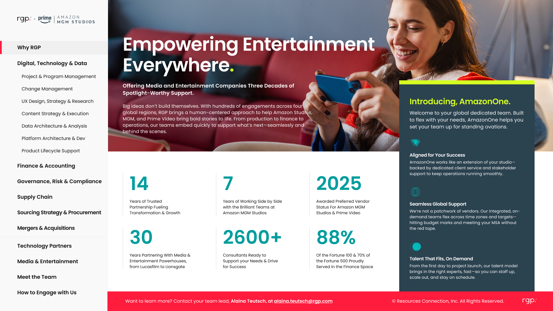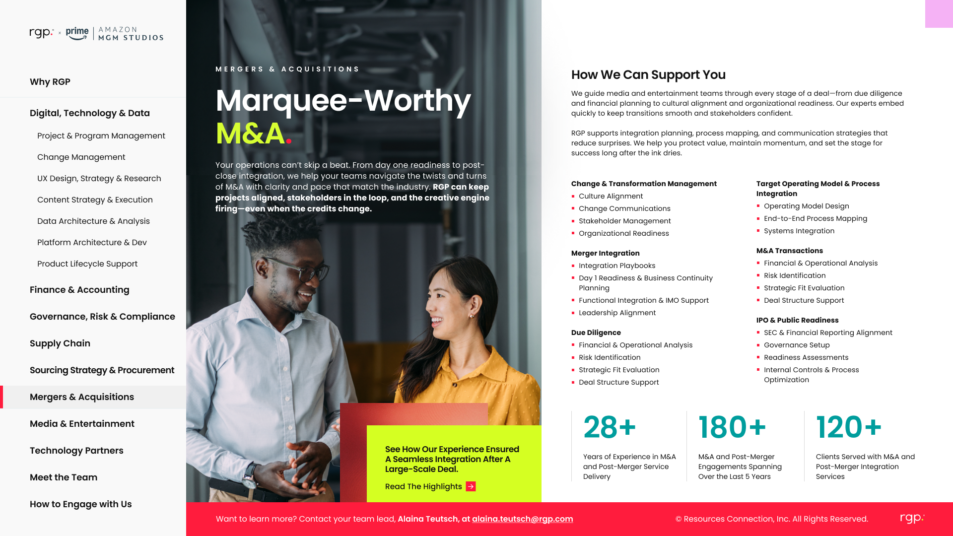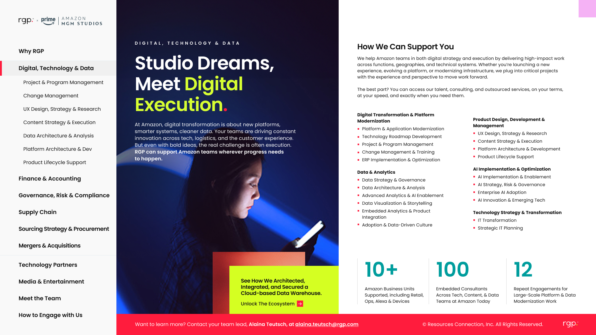 The work reframes RGP as an extension of Amazon’s teams, built for speed, scale, and delivery. Every page is tailored to how Amazon really operates: fast-moving, high-stakes, and execution-first. No filler, just clear connections between strategy and action across platform modernization, data, and post-merger integration. The tone is direct, specific, and outcome-focused, with just enough edge to stand out in a category that usually plays it safe.